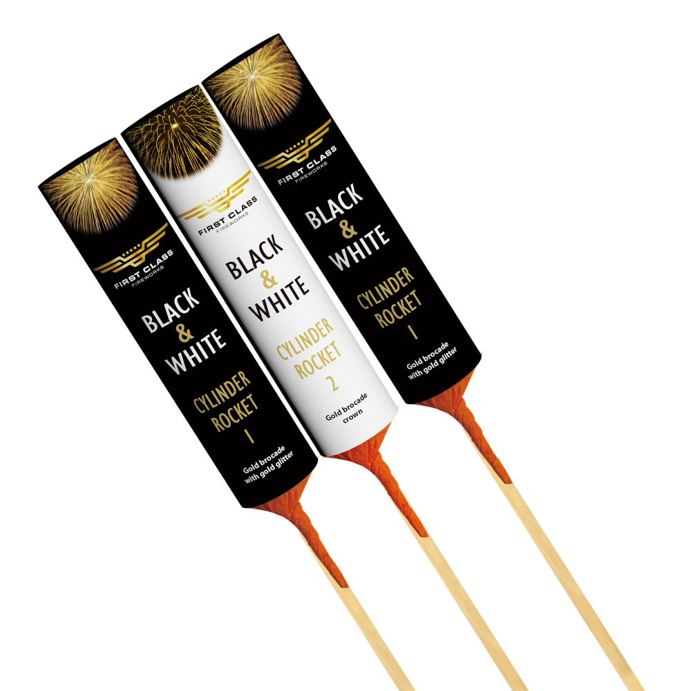 First Class Fireworks’ Cylinder Rockets from the Black & White series are a perfect choice for New Year’s Eve when you want high and impressive rocket effects without setting up an entire show. The product consists of 3 powerful cylinder rockets with a total powder weight of 210 g and should be fired outdoors, under adult supervision, and at an appropriate safe distance. Place the rockets in their own stable launch tubes, light the fuse – immediately step back – and let them light up the sky with stylish explosions and colours.